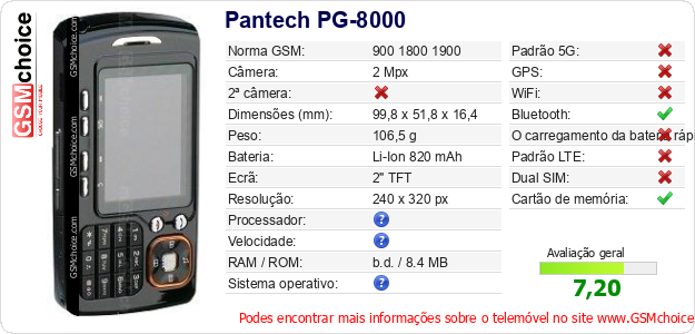 Dados sobre o telemóvel Pantech PG-8000 na sua página