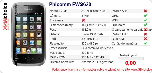 Dados sobre o telemóvel Phicomm FWS620 na sua página