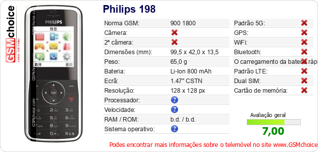 Dados sobre o telemóvel Philips 198 na sua página