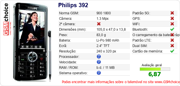 Dados sobre o telemóvel Philips 392 na sua página