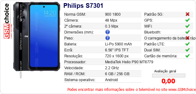 Dados sobre o telemóvel Philips S7301 na sua página