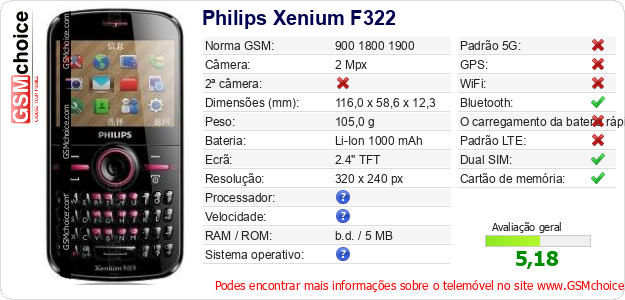 Dados sobre o telemóvel Philips Xenium F322 na sua página