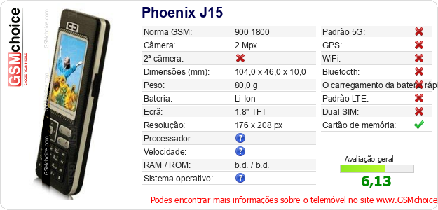 Dados sobre o telemóvel Phoenix J15 na sua página