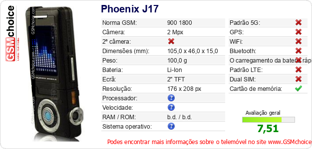 Dados sobre o telemóvel Phoenix J17 na sua página