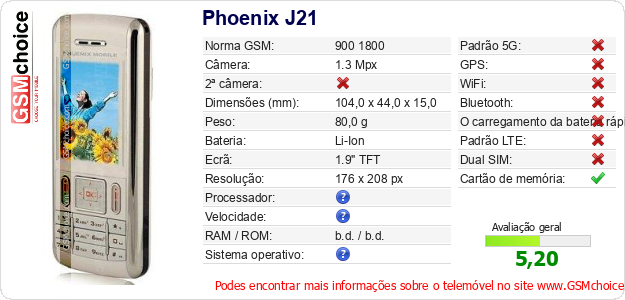 Dados sobre o telemóvel Phoenix J21 na sua página
