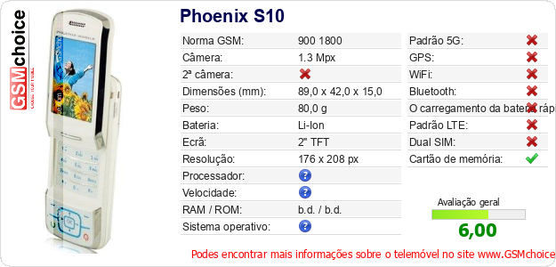 Dados sobre o telemóvel Phoenix S10 na sua página