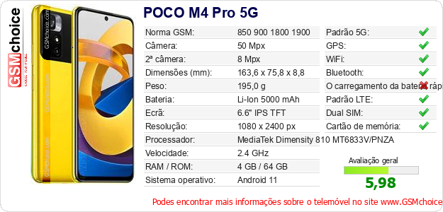 Dados sobre o telemóvel POCO M4 Pro 5G na sua página