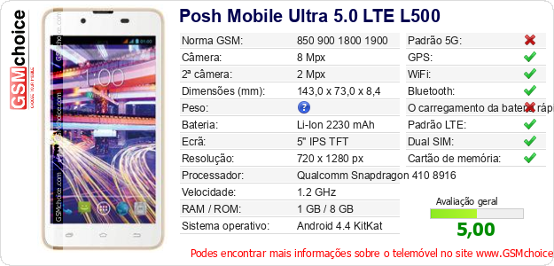 Dados sobre o telemóvel Posh Mobile Ultra 5.0 LTE L500 na sua página
