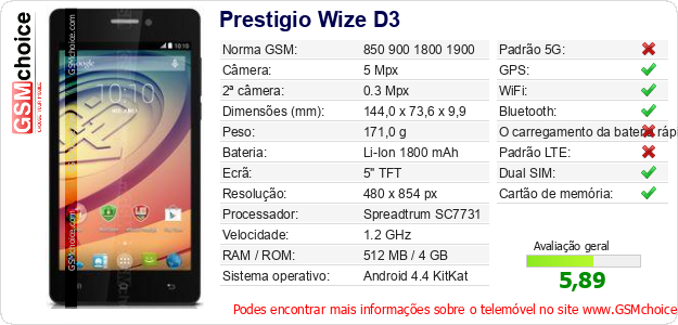 Dados sobre o telemóvel Prestigio Wize D3 na sua página