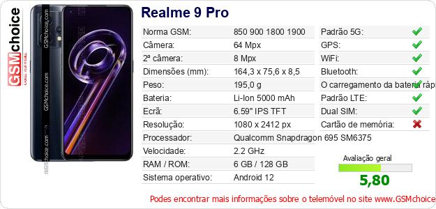 Dados sobre o telemóvel Realme 9 Pro na sua página
