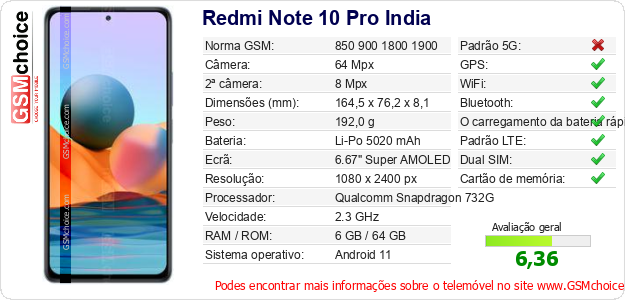 Dados sobre o telemóvel Redmi Note 10 Pro India na sua página