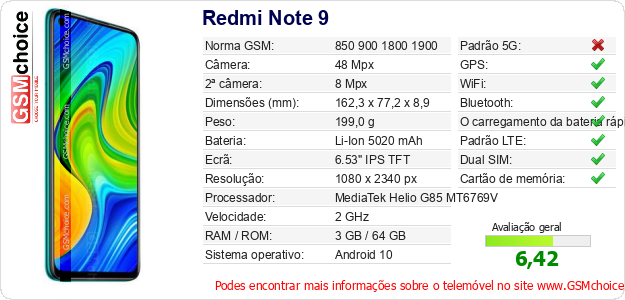 Dados sobre o telemóvel Redmi Note 9 na sua página
