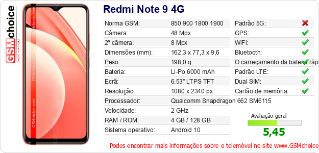Dados sobre o telemóvel Redmi Note 9 4G na sua página