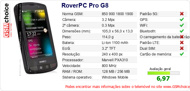 Dados sobre o telemóvel RoverPC Pro G8 na sua página