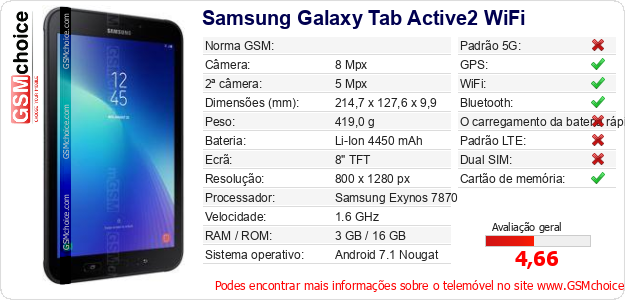 Dados sobre o telemóvel Samsung Galaxy Tab Active2 WiFi na sua página