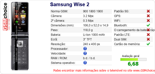 Dados sobre o telemóvel Samsung Wise 2 na sua página
