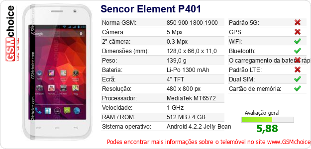 Dados sobre o telemóvel Sencor Element P401 na sua página