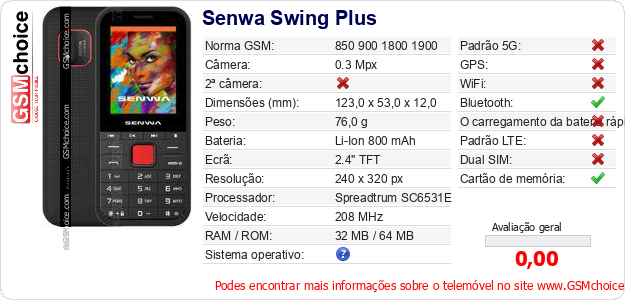 Dados sobre o telemóvel Senwa Swing Plus na sua página