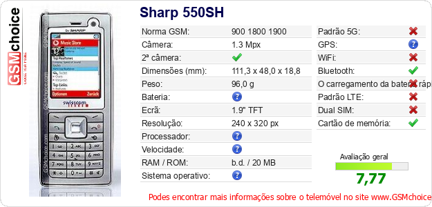 Dados sobre o telemóvel Sharp 550SH na sua página