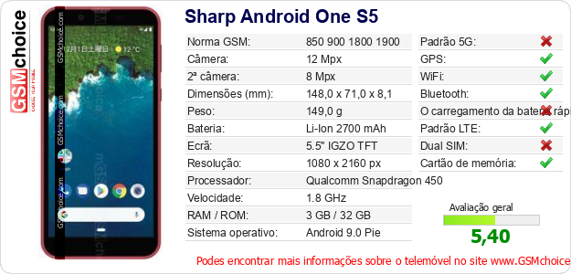 Dados sobre o telemóvel Sharp Android One S5 na sua página
