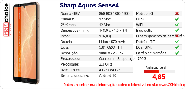 Dados sobre o telemóvel Sharp Aquos Sense4 na sua página