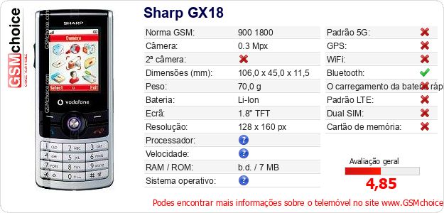 Dados sobre o telemóvel Sharp GX18 na sua página