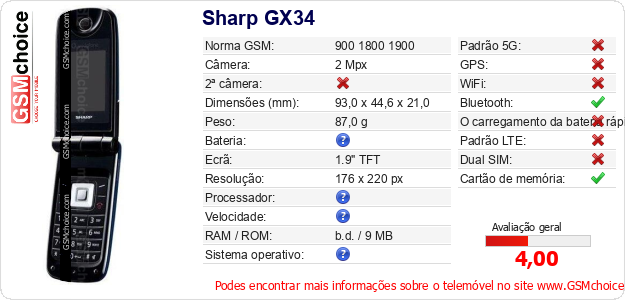 Dados sobre o telemóvel Sharp GX34 na sua página