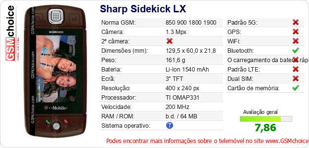 Dados sobre o telemóvel Sharp Sidekick LX na sua página