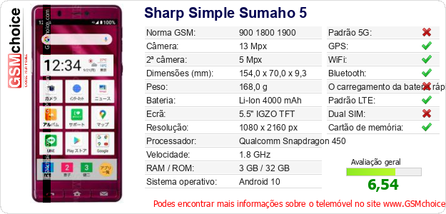 Dados sobre o telemóvel Sharp Simple Sumaho 5 na sua página