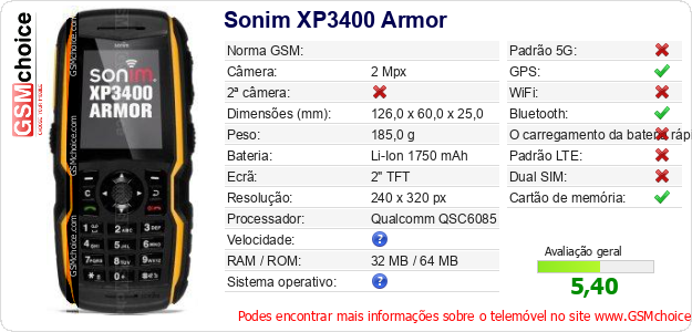 Dados sobre o telemóvel Sonim XP3400 Armor na sua página
