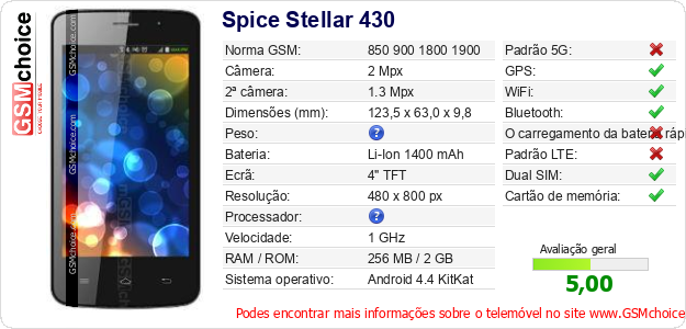 Dados sobre o telemóvel Spice Stellar 430 na sua página