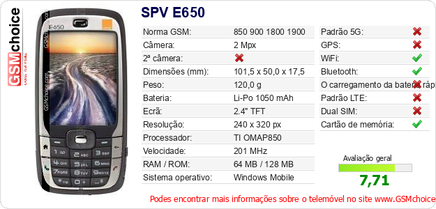 Dados sobre o telemóvel SPV E650 na sua página
