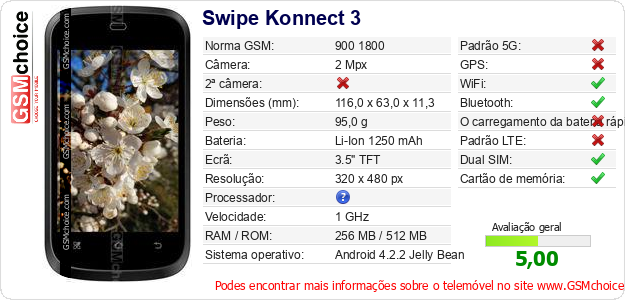 Dados sobre o telemóvel Swipe Konnect 3 na sua página