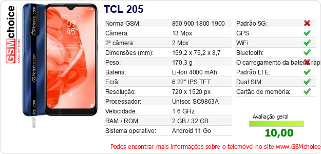 Dados sobre o telemóvel TCL 205 na sua página