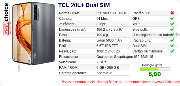 Dados sobre o telemóvel TCL 20L+ Dual SIM na sua página