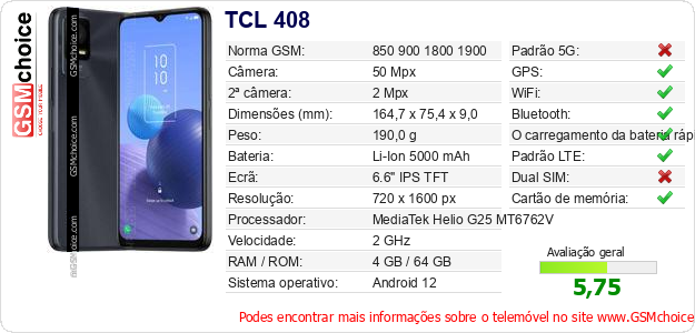 Dados sobre o telemóvel TCL 408 na sua página