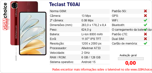 Dados sobre o telemóvel Teclast T60AI na sua página