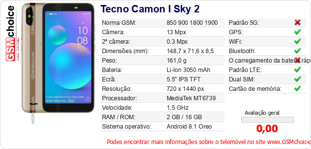 Dados sobre o telemóvel Tecno Camon I Sky 2 na sua página