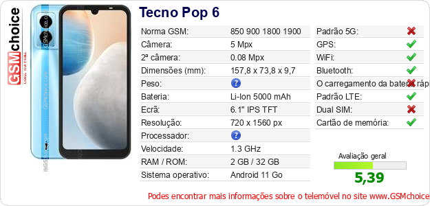 Dados sobre o telemóvel Tecno Pop 6 na sua página