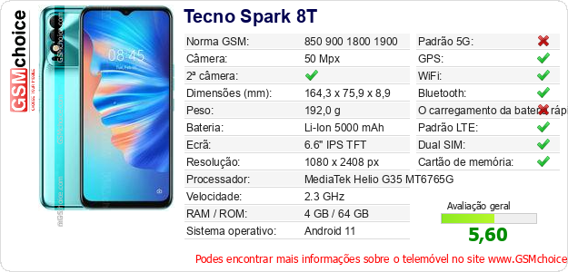 Dados sobre o telemóvel Tecno Spark 8T na sua página