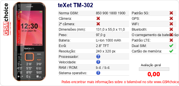 Dados sobre o telemóvel teXet TM-302 na sua página
