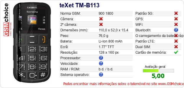 Dados sobre o telemóvel teXet TM-B113 na sua página