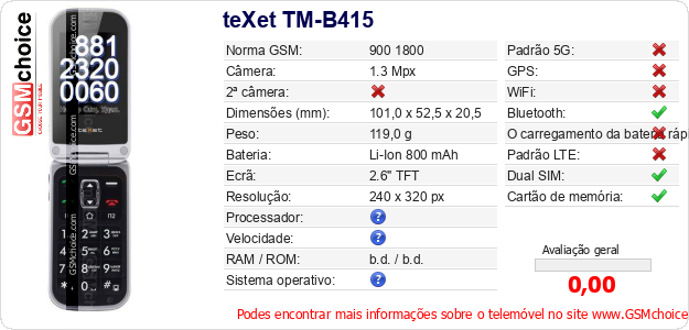 Dados sobre o telemóvel teXet TM-B415 na sua página