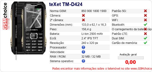 Dados sobre o telemóvel teXet TM-D424 na sua página