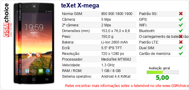 Dados sobre o telemóvel teXet X-mega na sua página