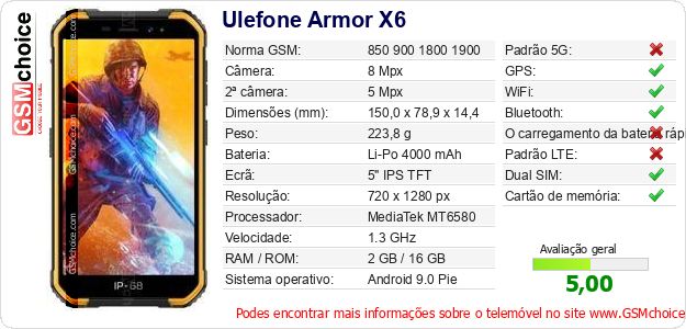 Dados sobre o telemóvel Ulefone Armor X6 na sua página