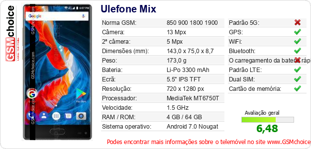 Dados sobre o telemóvel Ulefone Mix na sua página