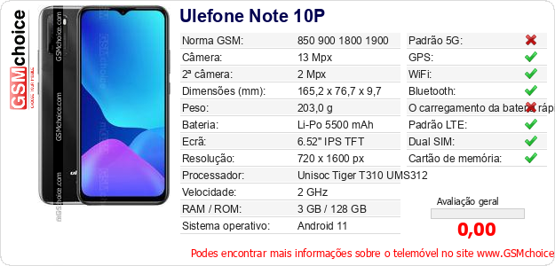 Dados sobre o telemóvel Ulefone Note 10P na sua página