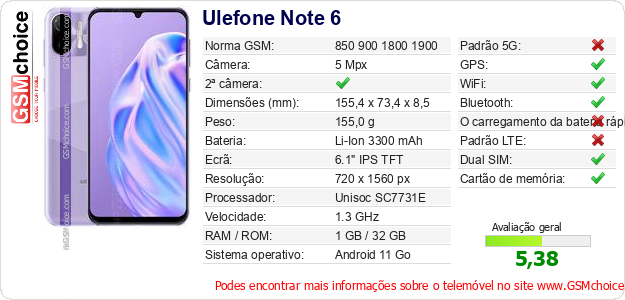 Dados sobre o telemóvel Ulefone Note 6 na sua página