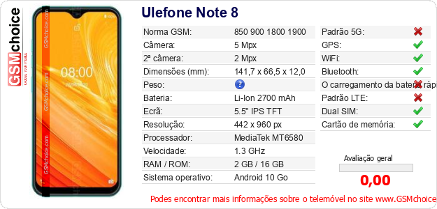 Dados sobre o telemóvel Ulefone Note 8 na sua página